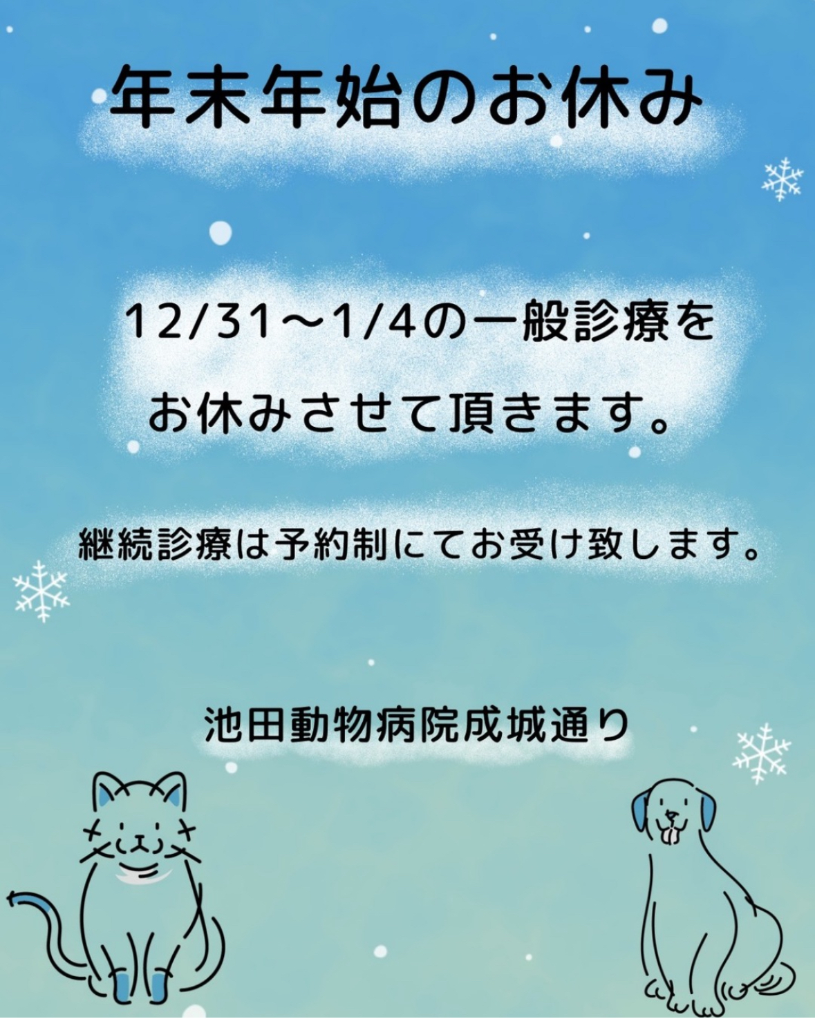 年末年始 休診のお知らせ 2025.12.12 お知らせ病院からのお知らせ休診のお知らせ 12月31日(水)~1月4日(日)は休診とさせていただきます。 なお、上記期間中でも、継続治療や急な体調不良などでお困りの患者様には、午前10時~13時の時間帯で対応可能です。 ご希望の方は、一度お電話またはLINEにてご連絡ください。