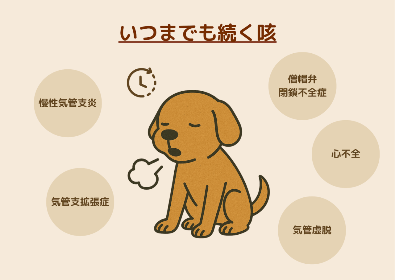 | 慢性的な炎症 | 慢性気管支炎、気管支拡張症 | 乾いた咳が続く/気温差や興奮で悪化 |