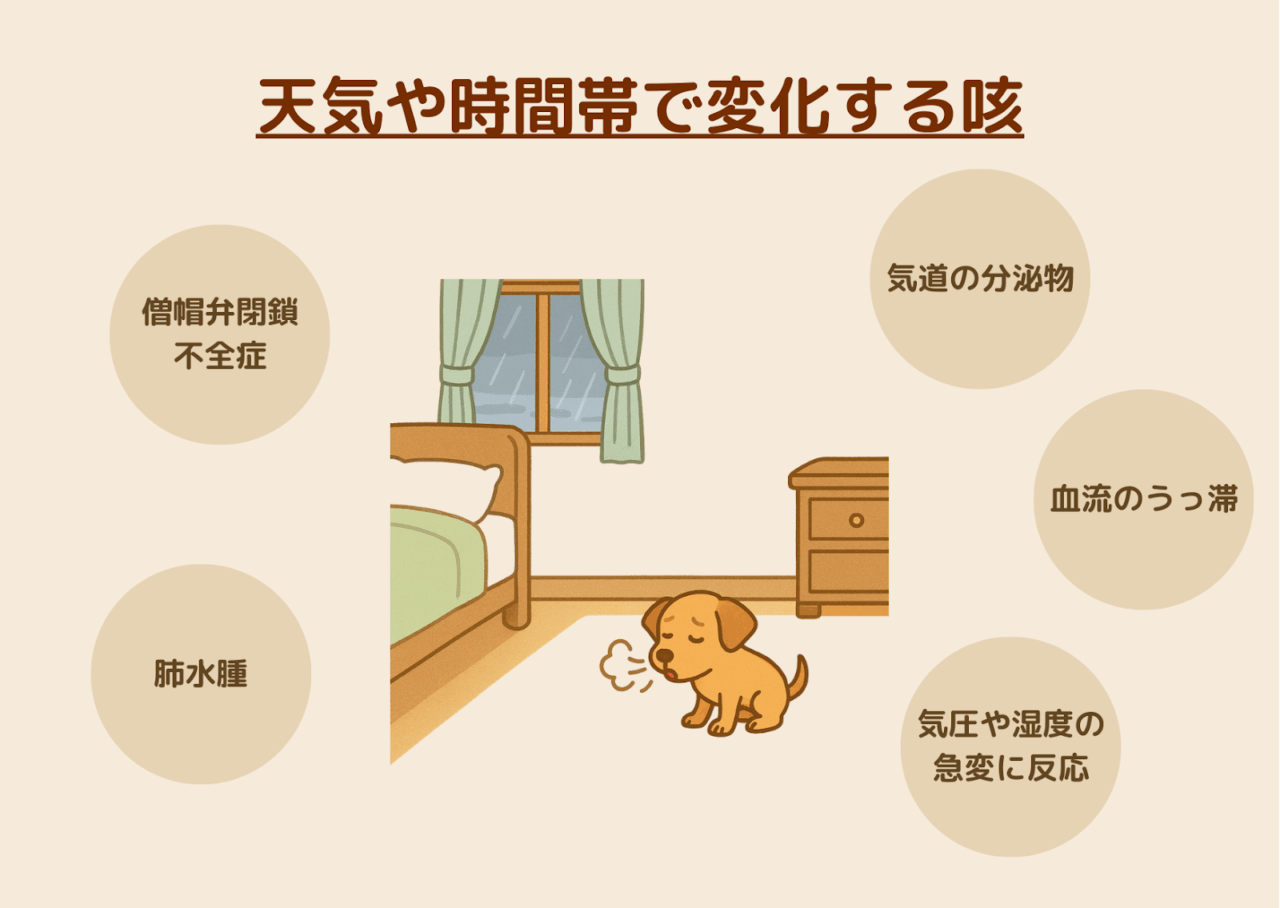 | 朝方 | 気道の分泌物や血流のうっ滞 | 起床直後に咳き込む/すぐに落ち着く |