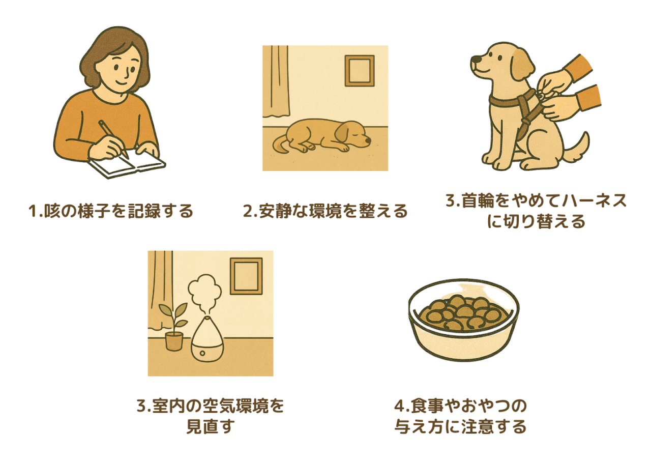 犬の咳にはさまざまな原因があるため、「これをすれば治る」という単一の方法はありません。しかし、日常生活の中でできる観察や環境の見直しが、診断や回復の助けになることがあります。