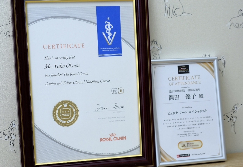 ロイヤルカナン・ヒルズ・ピュリナ大手三社の各フードアドバイザーも取得しています。1つのメーカーばかりを扱うということはなく、動物ファーストで考えています