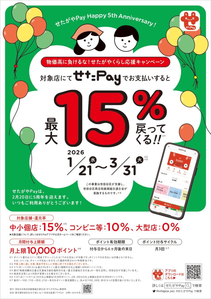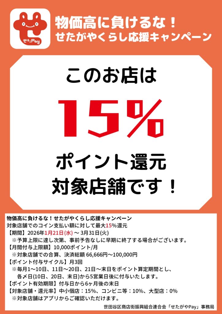ポイント還元の有無・内容は、せたがやPayのキャンペーン条件に基づき適用されます。