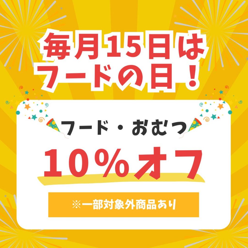 9月より、毎月15日をフードの日としまして、フード類・おむつ(一部対象外商品あり)を10%OFFで販売いたします!